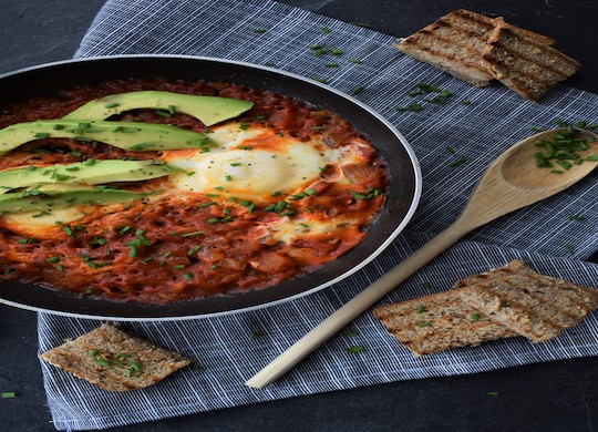 Con una cuchara hacer dos orificios en la salsa para añadir los huevos. Agregar los huevos y cocinar tapado durante tres minutos o hasta que la clara se vea cocida.